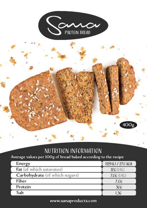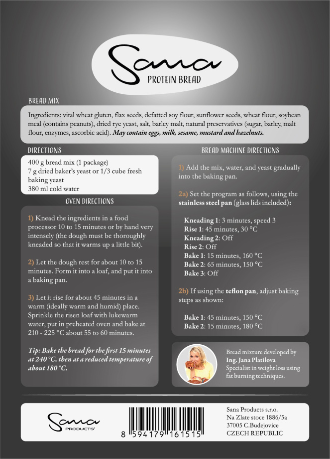 Sana protein bread is naturally high in fiber and protein, and low in carbohydrates. It's also moist, delicious, and full of seeds and can be eaten without butter or spreads because of this. It's great for weight loss, athletes, or vegetarians as it is a source of high protein. Preparation is simple: just add water and yeast, mix, let it rise, and bake. It works great in both a regular oven or in a bread maker, like the stainless steel Sana Smart Breadmaker.